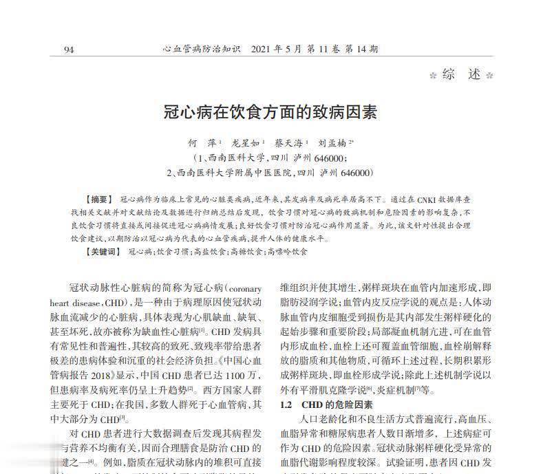 参考文献[1]何萍,龙星如,蔡天海,等.冠心病在饮食方面的致病因素[J].心血管病防治知识,2021,11(14):94-96.